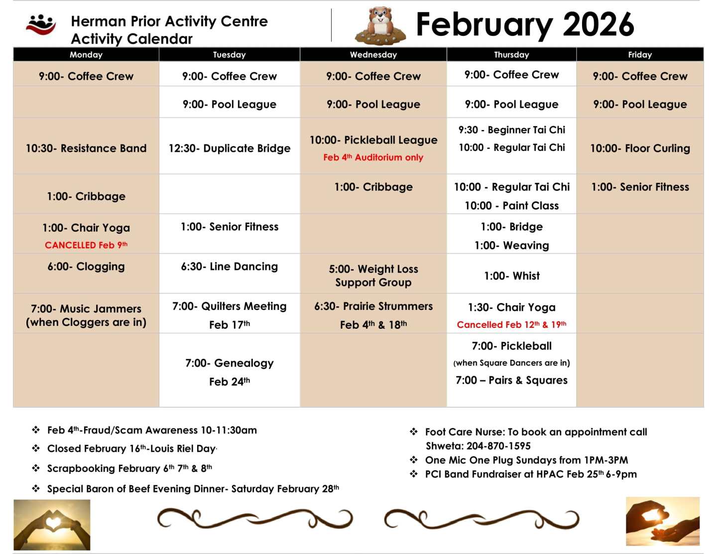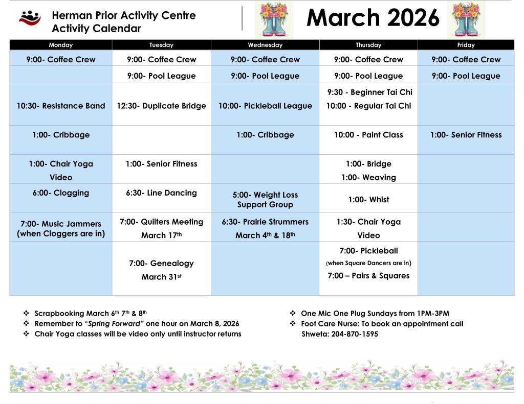 Activity Calendar Please remember all Activity dates, times and cancellations are subject to change. Thank you. Previous Activity Calendars February 2026 Activities January 2026 Activities December 2025 Activities Share this: Share on X (Opens in new window) X Share on Facebook (Opens in new window) Facebook Like Loading...